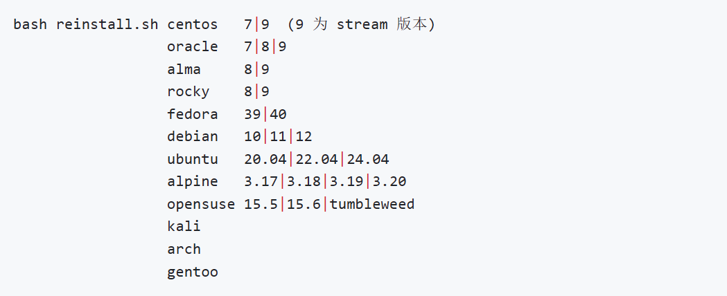 - reinstall是一个支持Linux/Windows一键重装系统的脚本,支持安装 12 种常见 Linux 发行版,专门适配低配小鸡,解决内存过少导致无法进行网络安装。