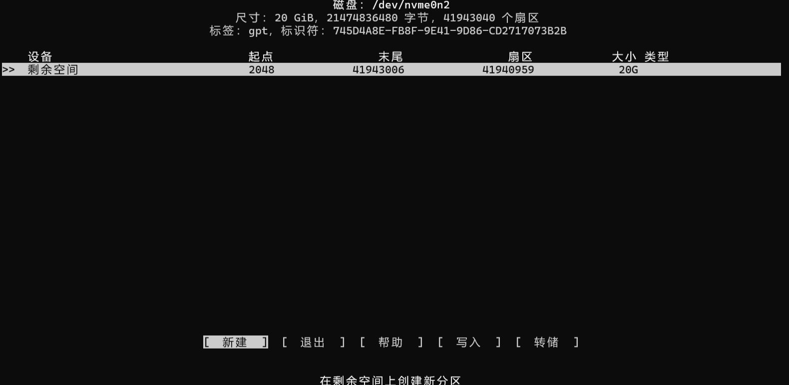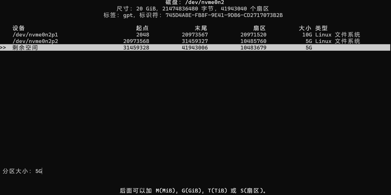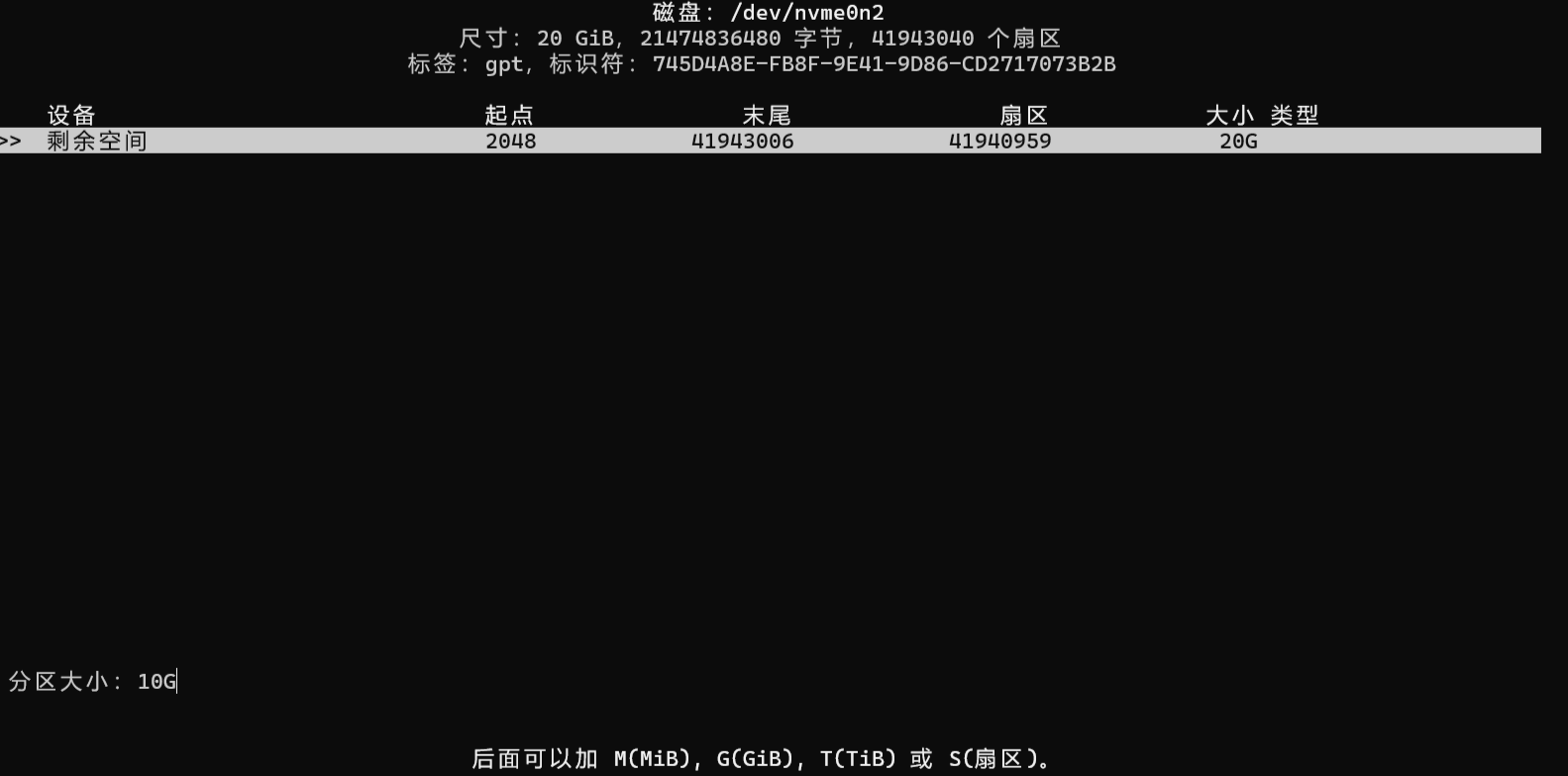 Disk /dev/nvme0n2:20 GiB,21474836480 字节,41943040 个扇区