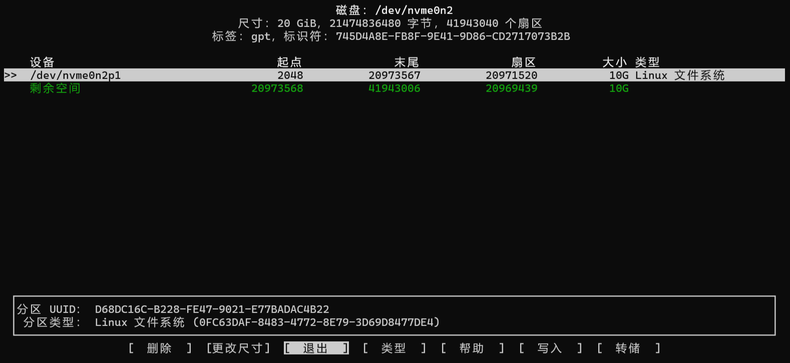 /dev/nvme0n2p1 2048 20973567 20971520 10G Linux 文件系统