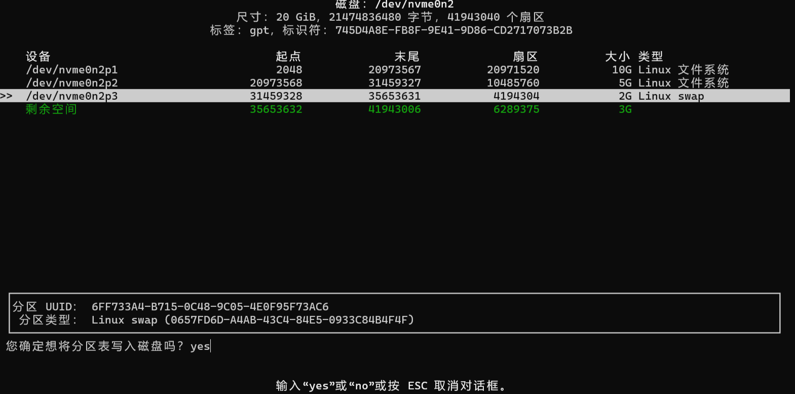 输入 yes 并回车,最后退出便可完成以上步骤,此方法对比命令行更为简单便捷,当然以上是根据我个人的示例做出的对磁盘的编辑和设置,具体需要你们自己对磁盘所需做出更变。