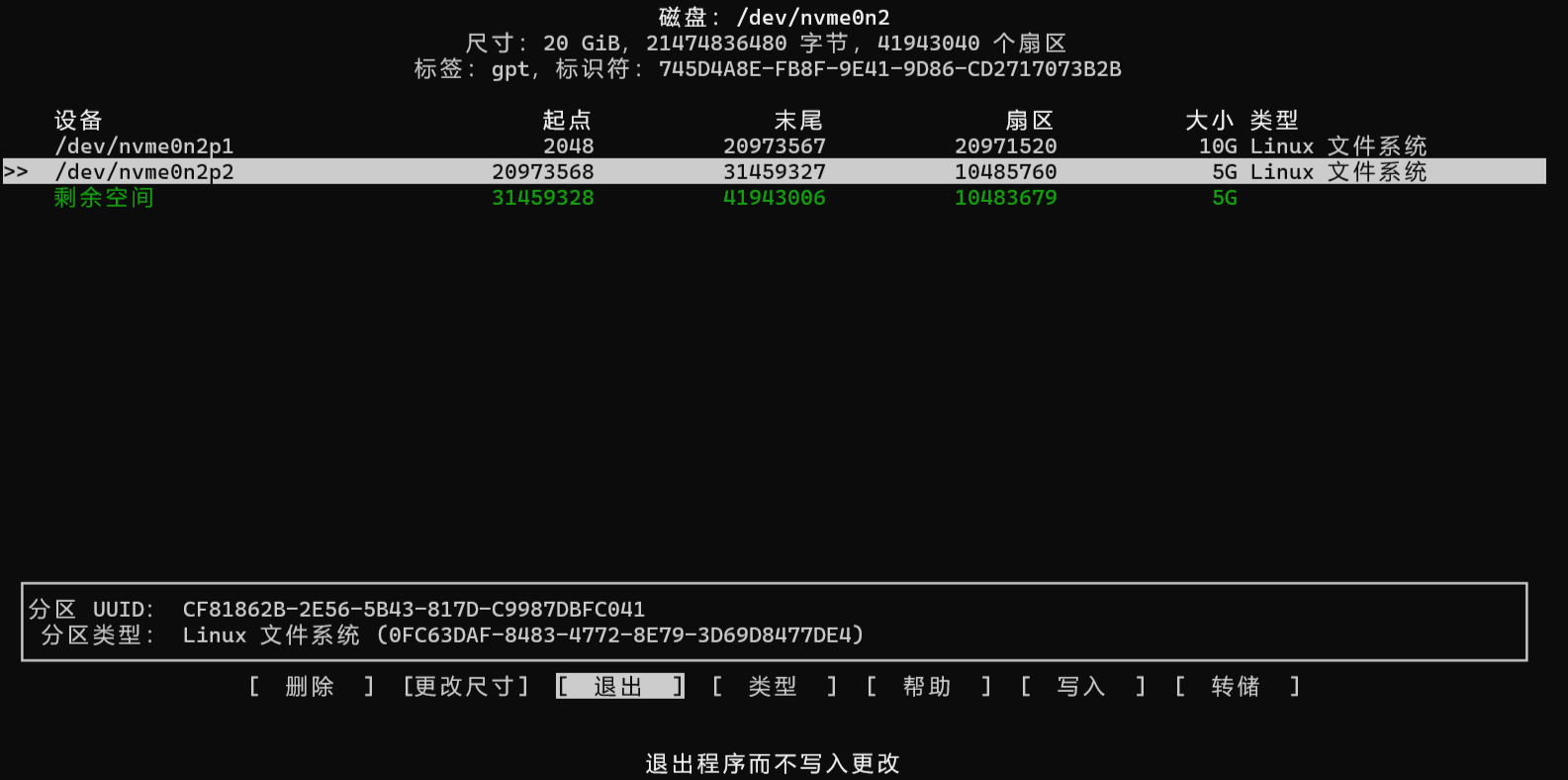 # 完整的编辑磁盘流程,我以虚拟机的nvme0n2示例(总20G)