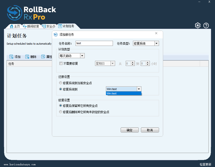 4.再添加任务界面输入任务名称,任务类型选择修复系统(即恢复),计划类型为每次启动,修复到选择您创建的安全点(我这里的名称是test)最后点击确定即可。